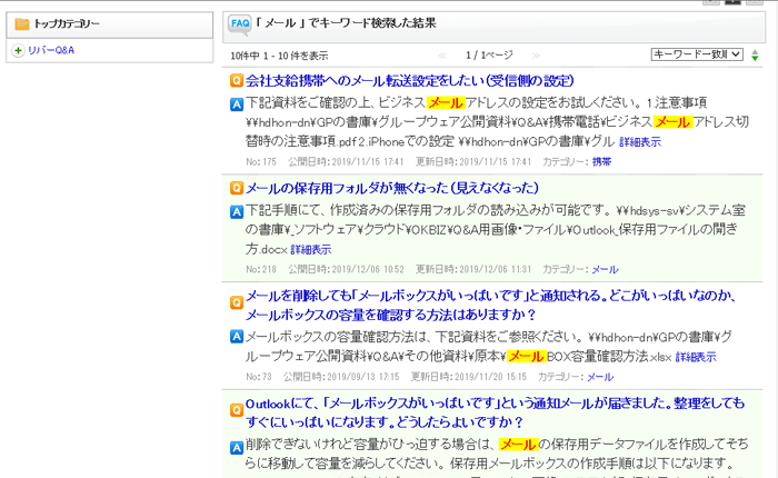例えば、「メール」でキーワード検索すると、