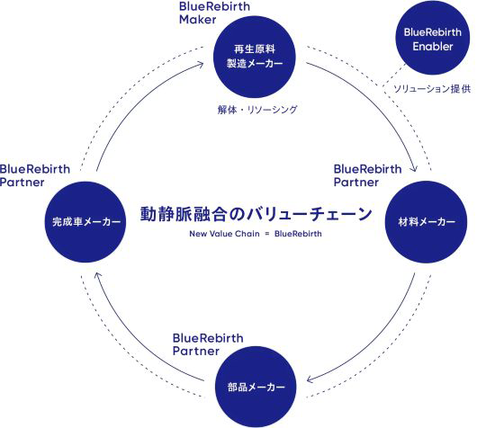 奥田:私たちBlueRebirth協議会は、日本の自動車産業におけるサーキュラーエコノミーを実現するために、動脈産業(生産・販売)と静脈産業(回収・再生)のバリューチェーンを融合して自動車に使われている材料を再び自動車に活用する「Car to Car」のエコシステムの構築をめざしています。