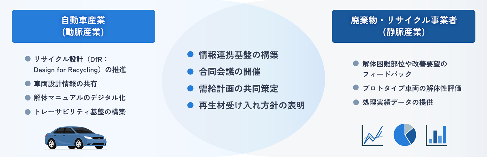 自動車産業(動脈産業)と廃棄物処理・リサイクル事業者(静脈産業)は、これまで別々の領域で活動してきたため、設計段階からのリサイクル配慮や、リサイクル事業者のニーズを反映した製品設計が十分に行われていません。