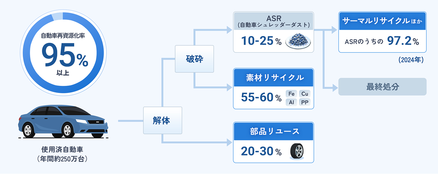日本のリサイクル率が高い要因として、法制度による処理費用の確保、約3,000社の解体業者と約100社の破砕業者による技術力の高い作業、製鉄所やセメント工場など、強固な再資源化インフラの存在が挙げられます。特にASRについては、海外では埋立処分が主流であるのに対し、日本ではセメント製造での熱エネルギー利用などサーマルリサイクルとして有効活用しています。